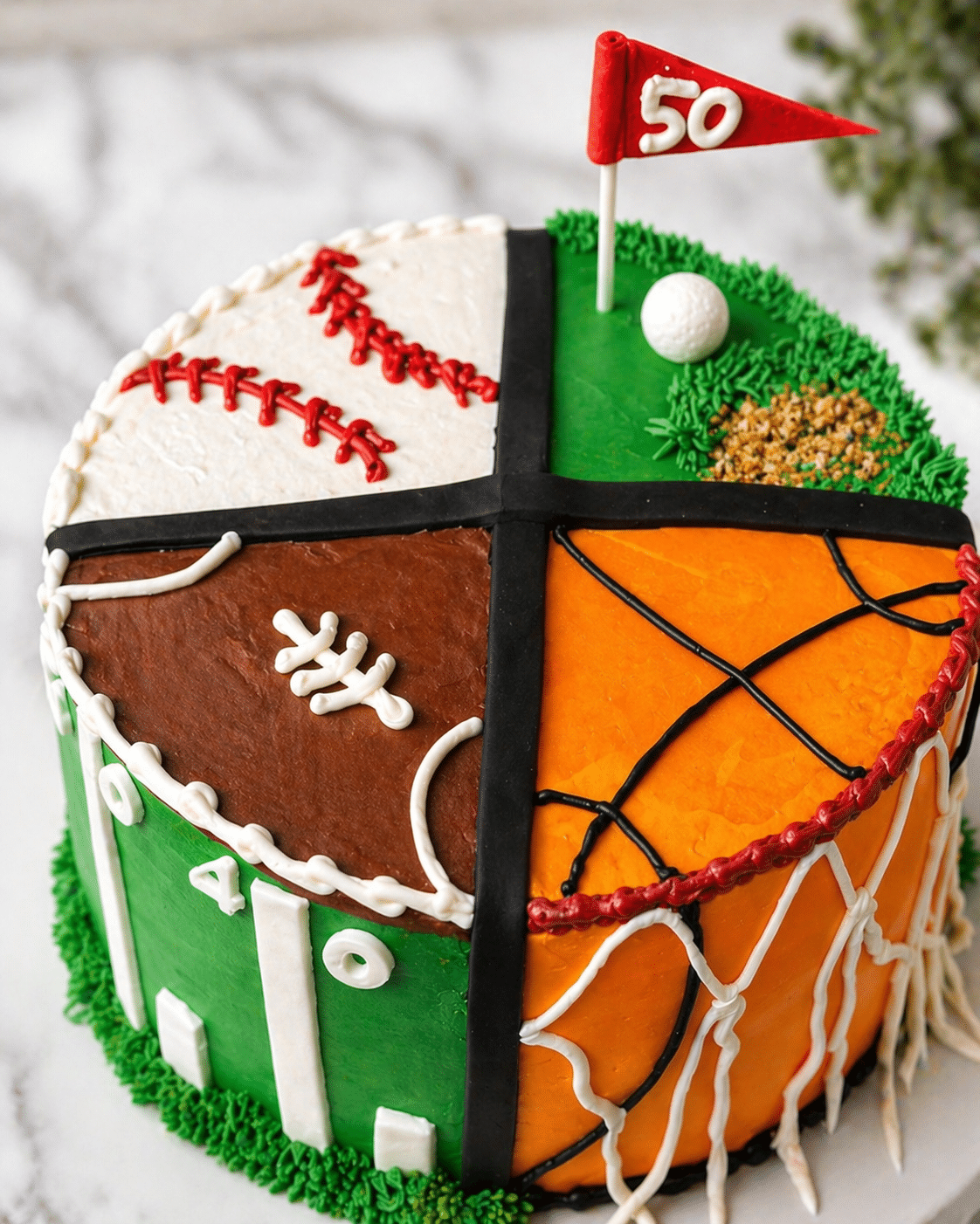 This unique design features the cake divided into four distinct sections, each representing a different sport—such as basketball, golf, baseball, and football. Each quadrant is customized with themed colors, textures, and edible details to bring every sport to life in one cohesive design.