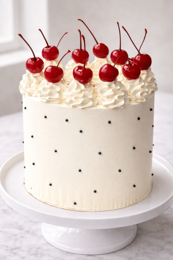 Indulge in the timeless sophistication of our Elegant Black & White Cherry Cake—a masterpiece of minimalism and charm. This exquisite white cake is adorned with delicate black dots, creating a striking contrast that enhances its aesthetic appeal. Topped with luscious, glossy cherries, it exudes both elegance and indulgence.