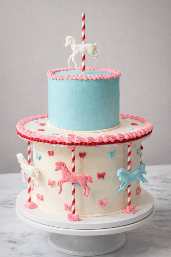 This whimsical two-tier design features pastel pink, blue, and white details, complete with carousel horses and candy-striped poles, creating a charming fairground feel that feels playful yet beautifully composed. It’s imaginative without being overwhelming, detailed without feeling busy — a cake that instantly captures hearts.