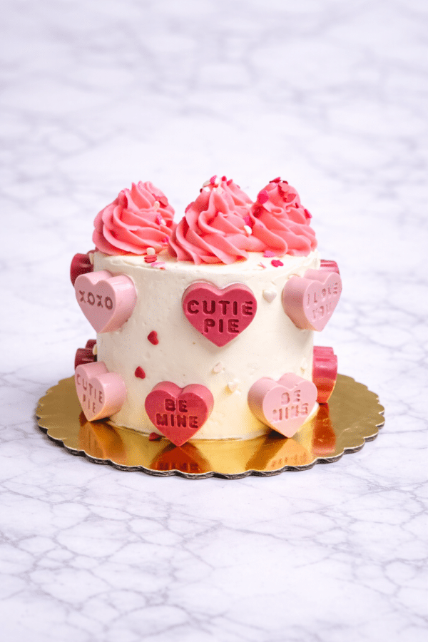 Meet our Cutie Pie Mini Cake — a charming 4” cake designed for sharing (or not). Frosted in smooth vanilla buttercream and finished with pink swirls, festive sprinkles, and adorable conversation heart details, this mini cake is equal parts sweet and celebratory.