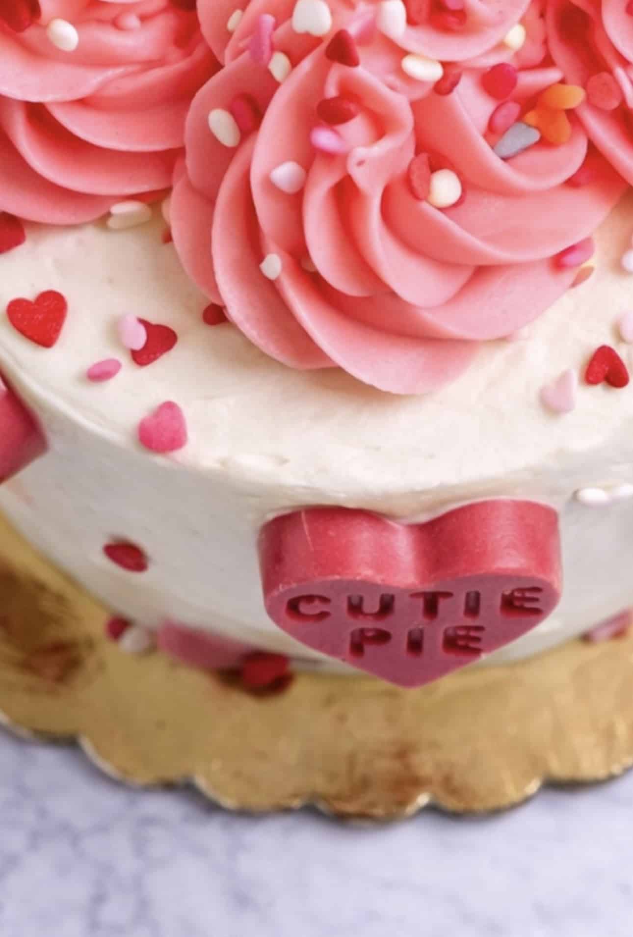 • Decorated with Valentine-inspired buttercream and candy hearts