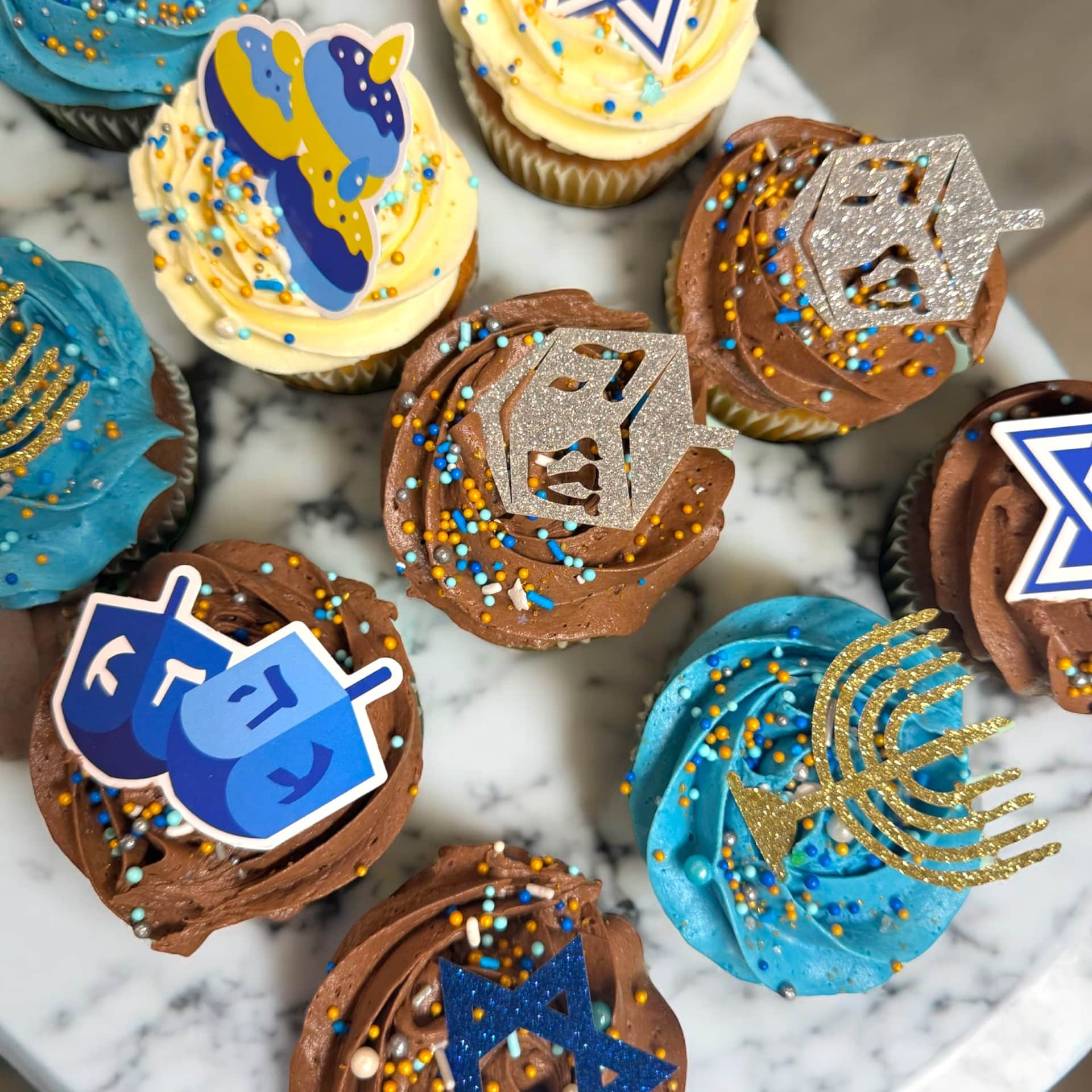Celebrate the season with our Hanukkah Cupcakes, topped with festive blue-and-white designs and smooth buttercream swirls. Each cupcake features rich, moist cake and holiday decorations inspired by menorahs, dreidels, and classic Hanukkah symbols. Perfect for gifting, parties, school events, and family celebrations.