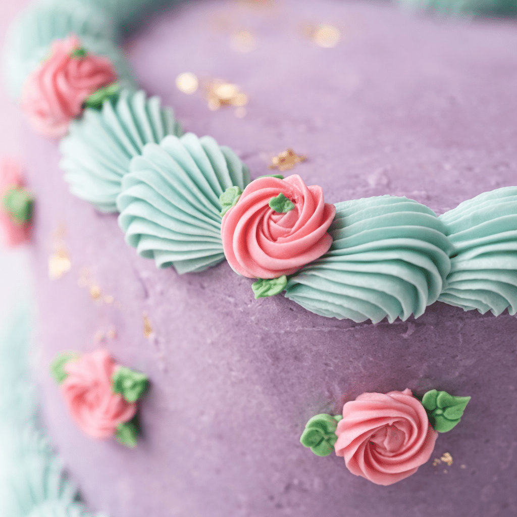 Covered in smooth lavender buttercream and adorned with aqua piping and delicate pink rosettes, this cake feels graceful, intentional, and beautifully composed. Every detail is soft yet precise — designed to express emotion without excess.