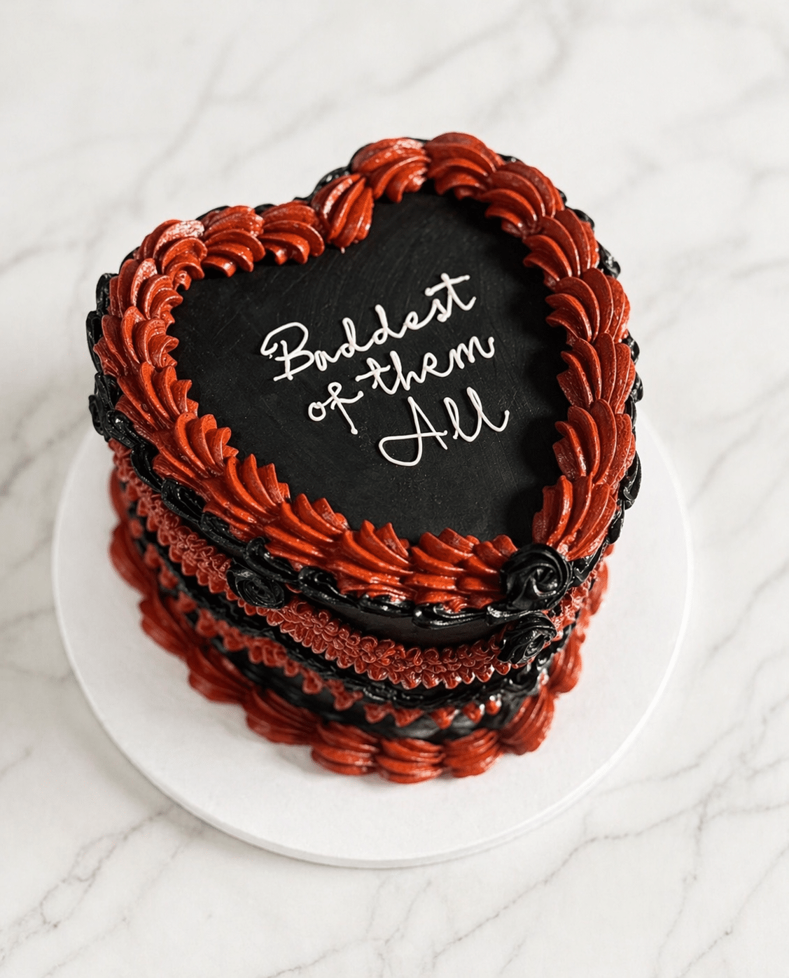 Our Midnight Vintage Heart Cake is a striking take on the classic vintage style — featuring a smooth black buttercream base paired with intricate red ribbon piping and delicate detailing.