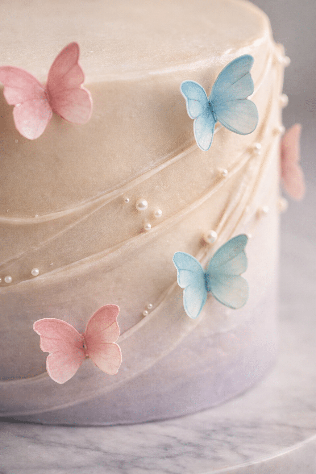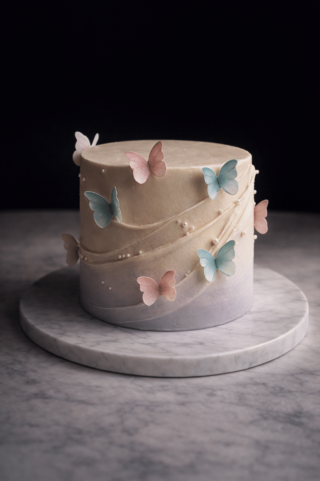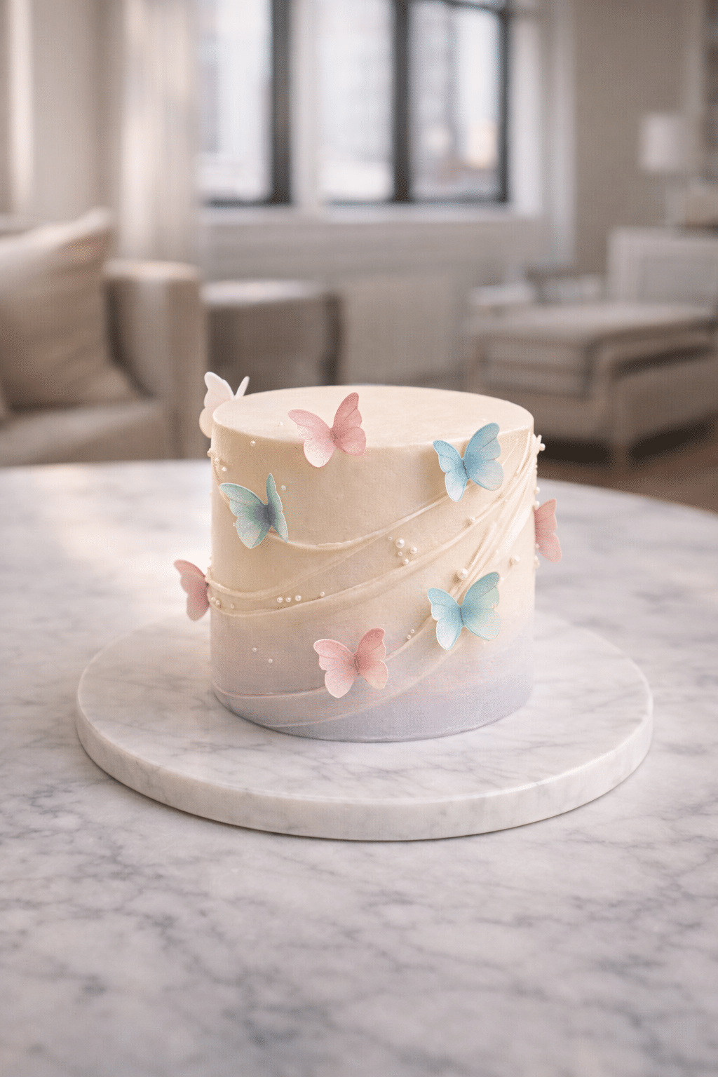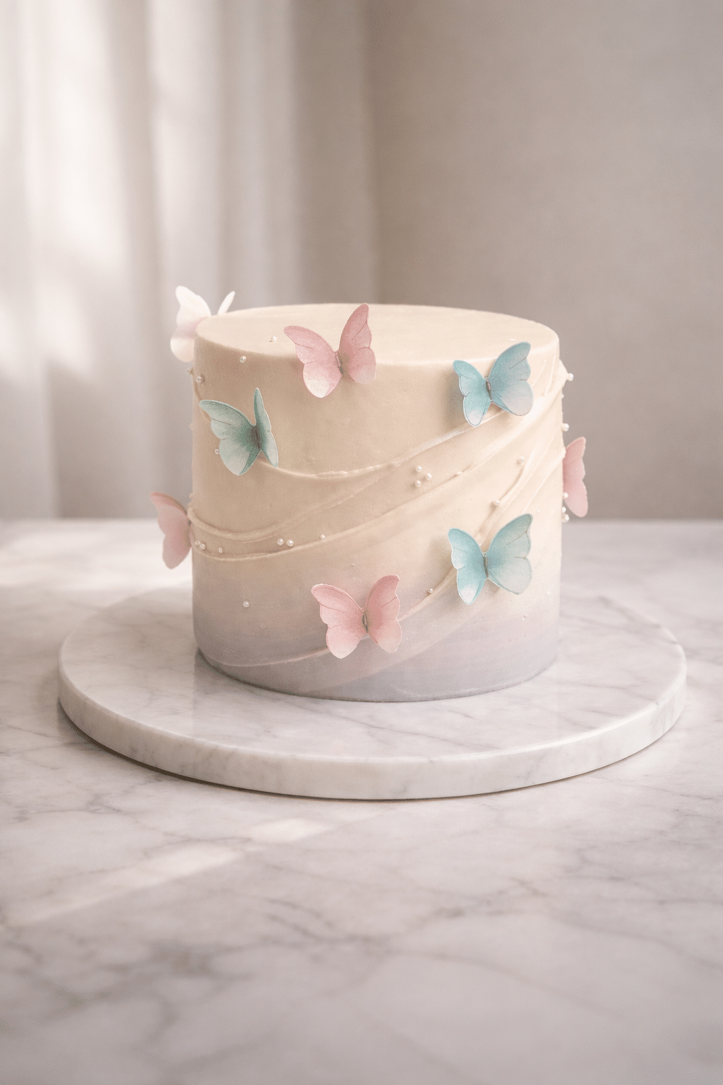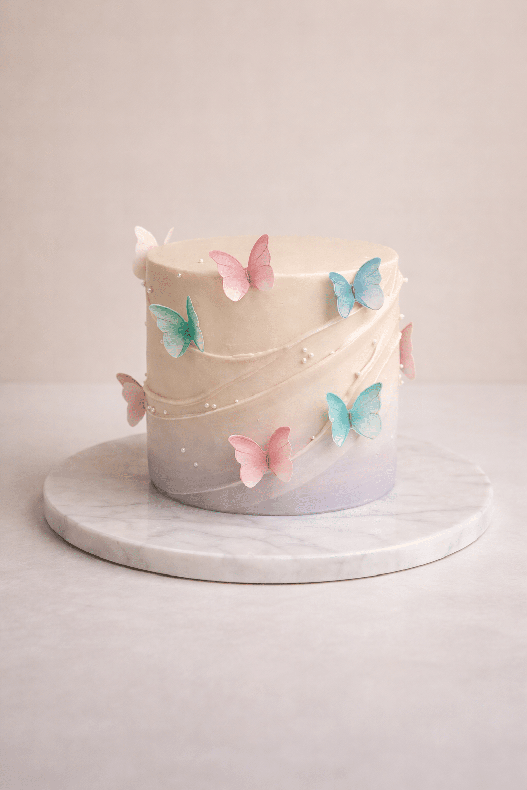 Our Pastel Butterfly Dream Cake is a whimsical delight, featuring soft ombré buttercream shades of blush, lavender, and sky blue. Adorned with delicate edible butterflies and shimmering pearl accents, this cake is perfect for birthdays, baby showers, or any celebration that calls for elegance and charm.